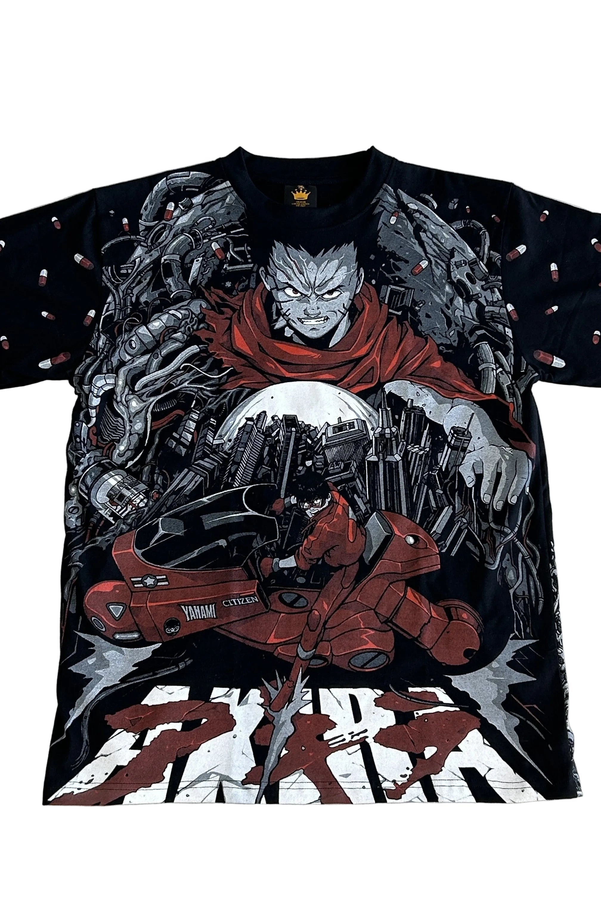 Pure cyberpunk energy wrapped head to toe. This statement tee features an all-over graphic print inspired by the культ classic Akira, showcasing Akira’s explosive world alongside the legendary red motorbike made iconic by Kaneda. Speed, rebellion, and futuristic chaos collide in a design that hits from every angle.