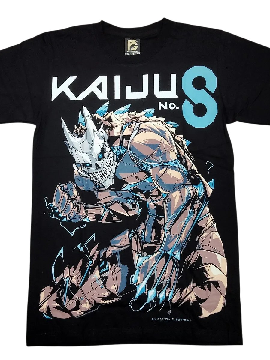 Unleash monstrous power with this high-quality black cotton T-shirt featuring a bold graphic inspired by Kaiju No. 8.