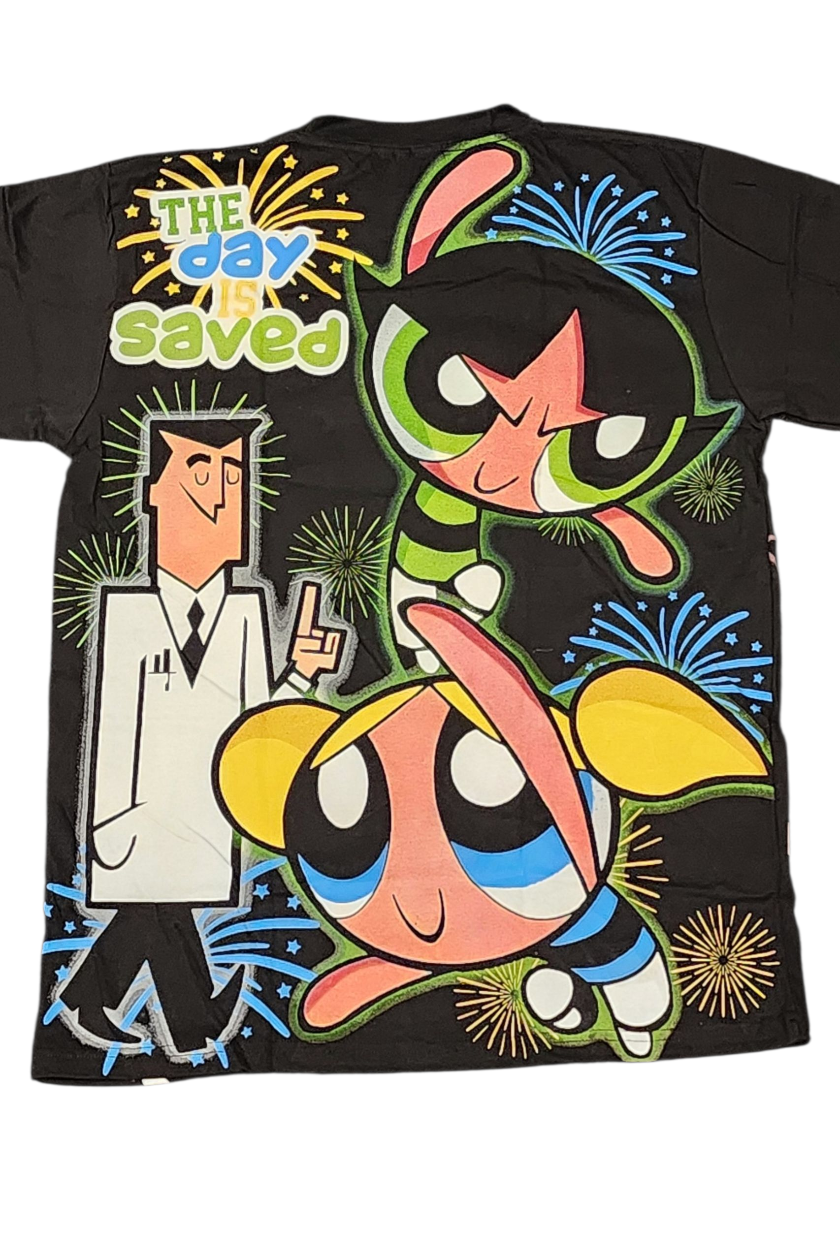Spin it around and the back delivers even more girl-power goodness with Bubbles, Buttercup, and Professor Utonium, all framed by the classic Powerpuff Girls slogan: “THE DAY IS SAVED!”