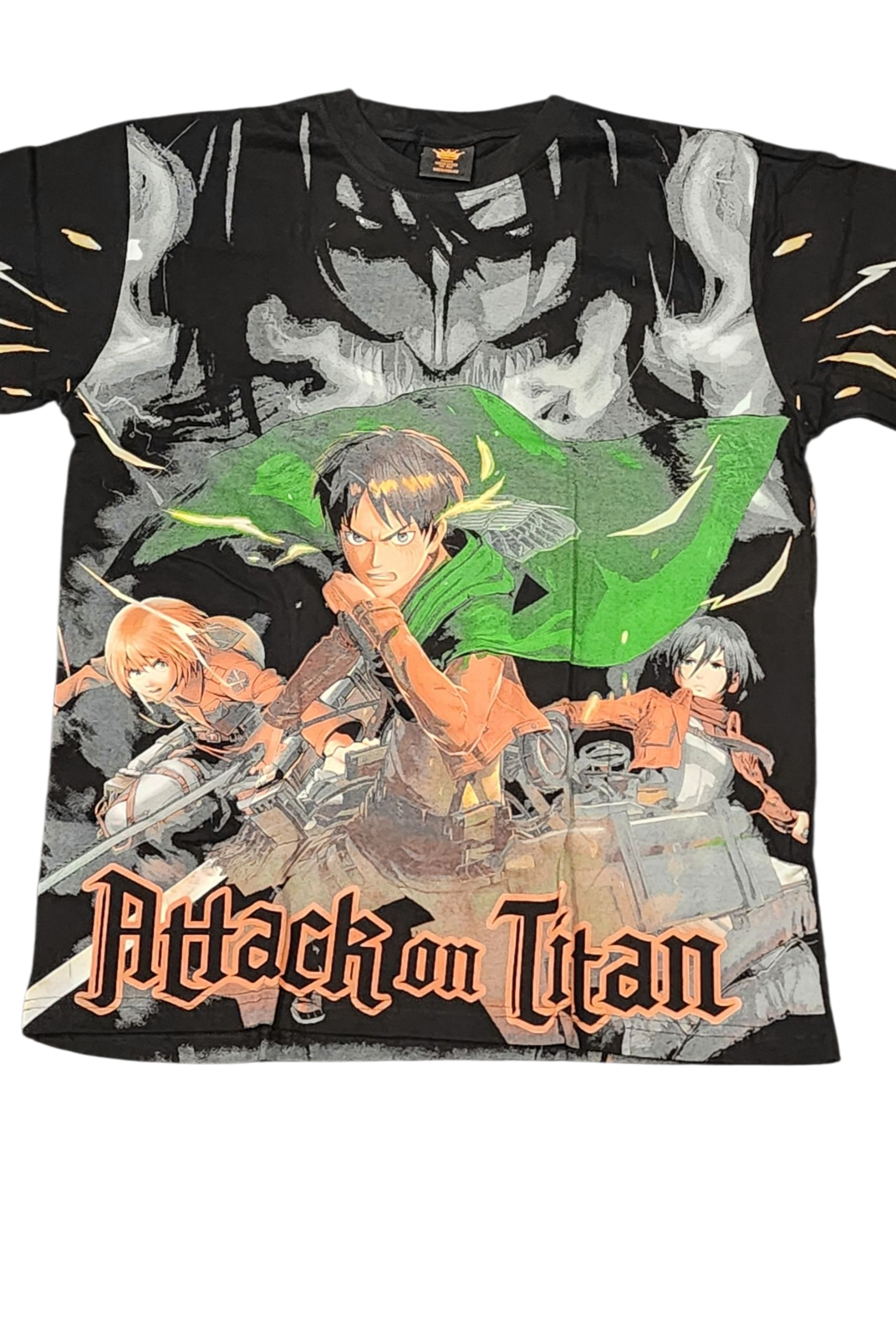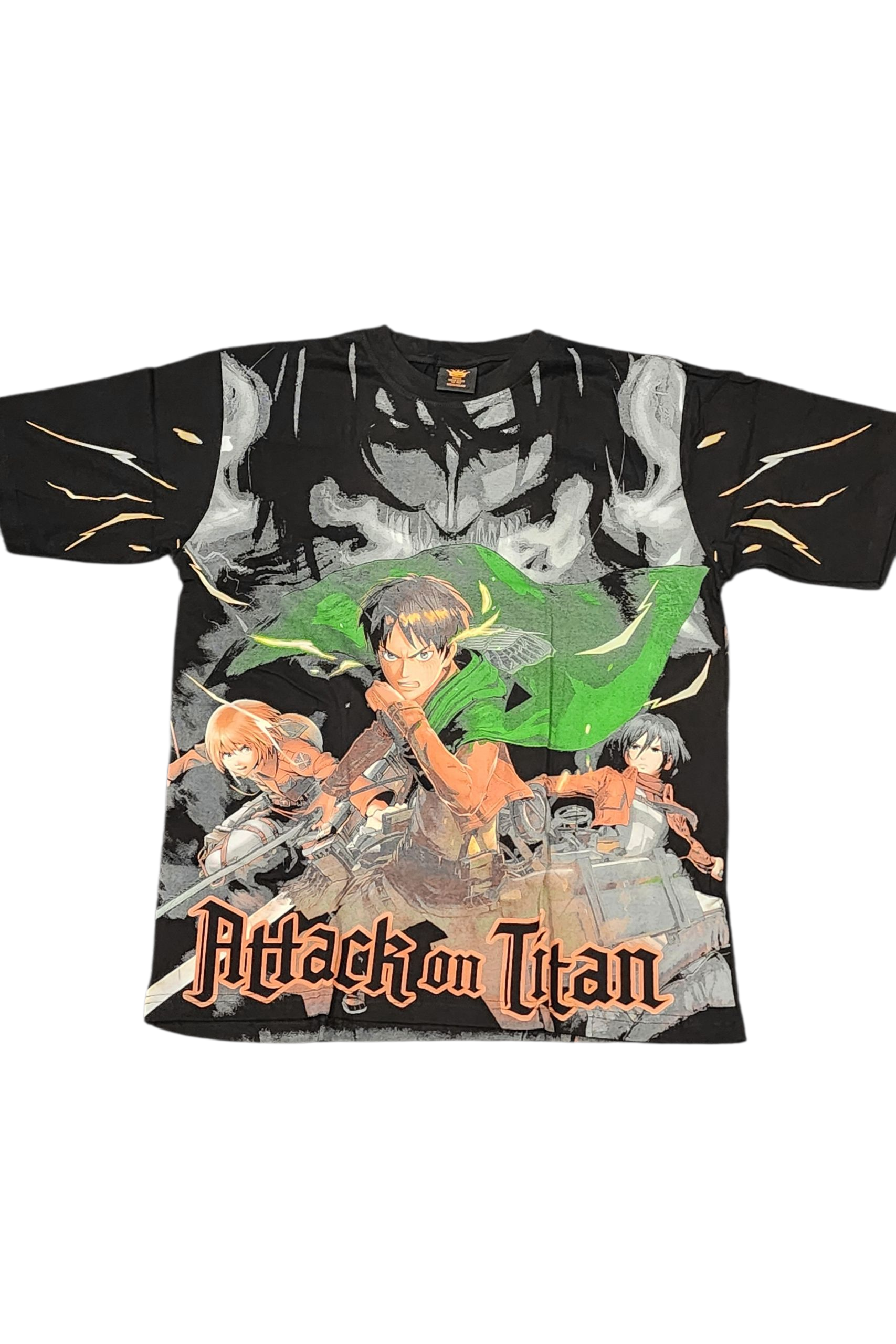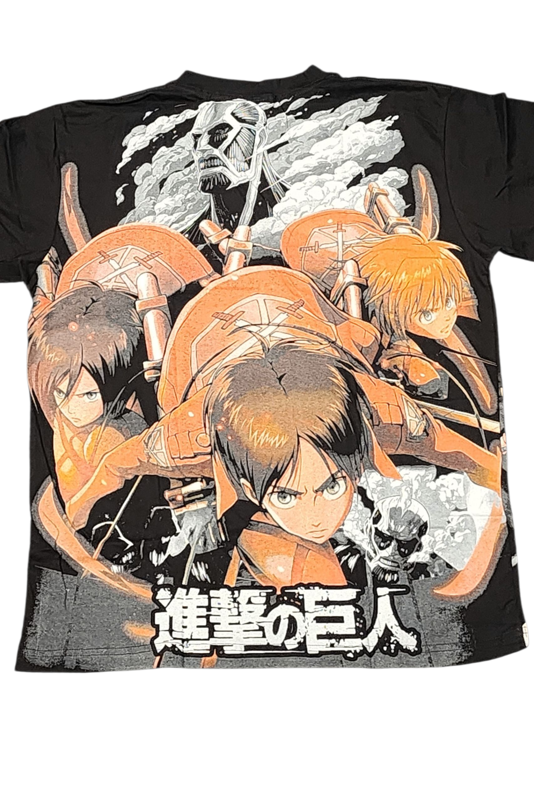 Turn it around and the back graphic brings the intensity to a whole new level — the trio standing together, overshadowed by the towering, menacing presence of the Colossus Titan looming behind them. The contrast of humanity vs. devastation is dramatic, cinematic, and instantly recognisable to any AOT fan.