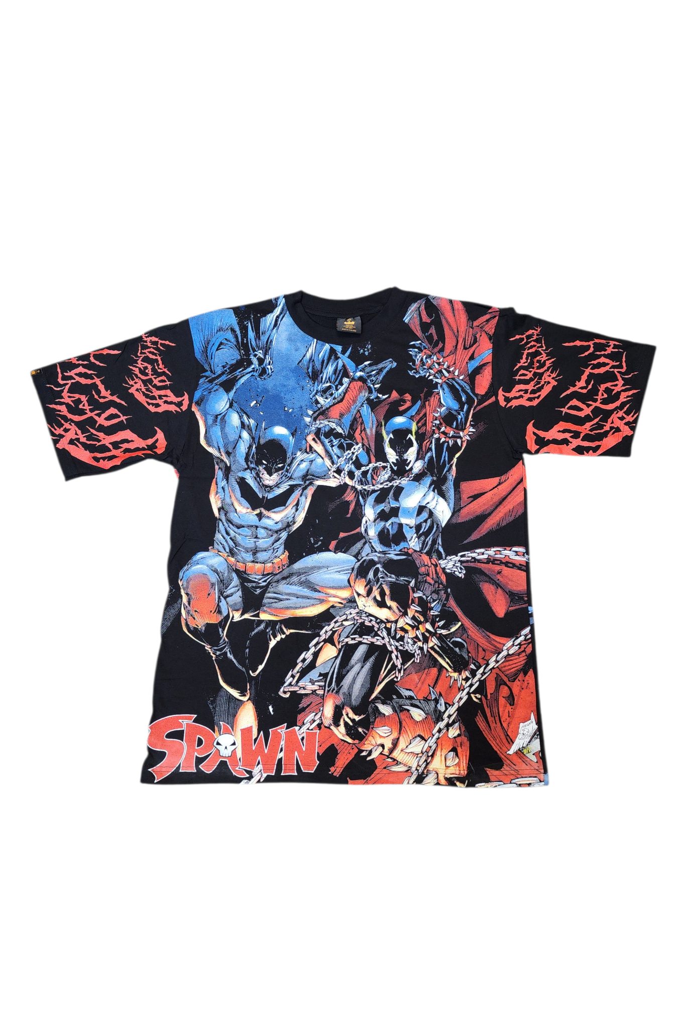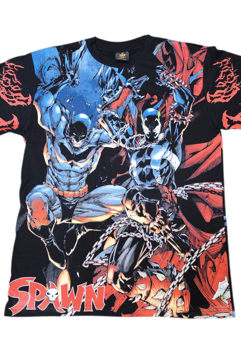 Two dark legends collide in this explosive tee featuring an all-over graphic print of Batman vs Spawn. Blending Gotham’s relentless vigilante with the hellspawned warrior of the shadows, this design delivers maximum intensity, atmosphere, and crossover power from every angle.