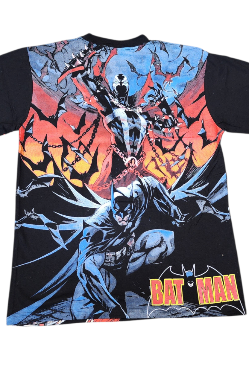 The immersive all-over artwork wraps the tee in gritty detail — capes, chains, darkness, and raw energy — creating a bold statement piece for fans of darker comics and iconic showdowns. Crafted from premium cotton, it balances standout visuals with everyday comfort.