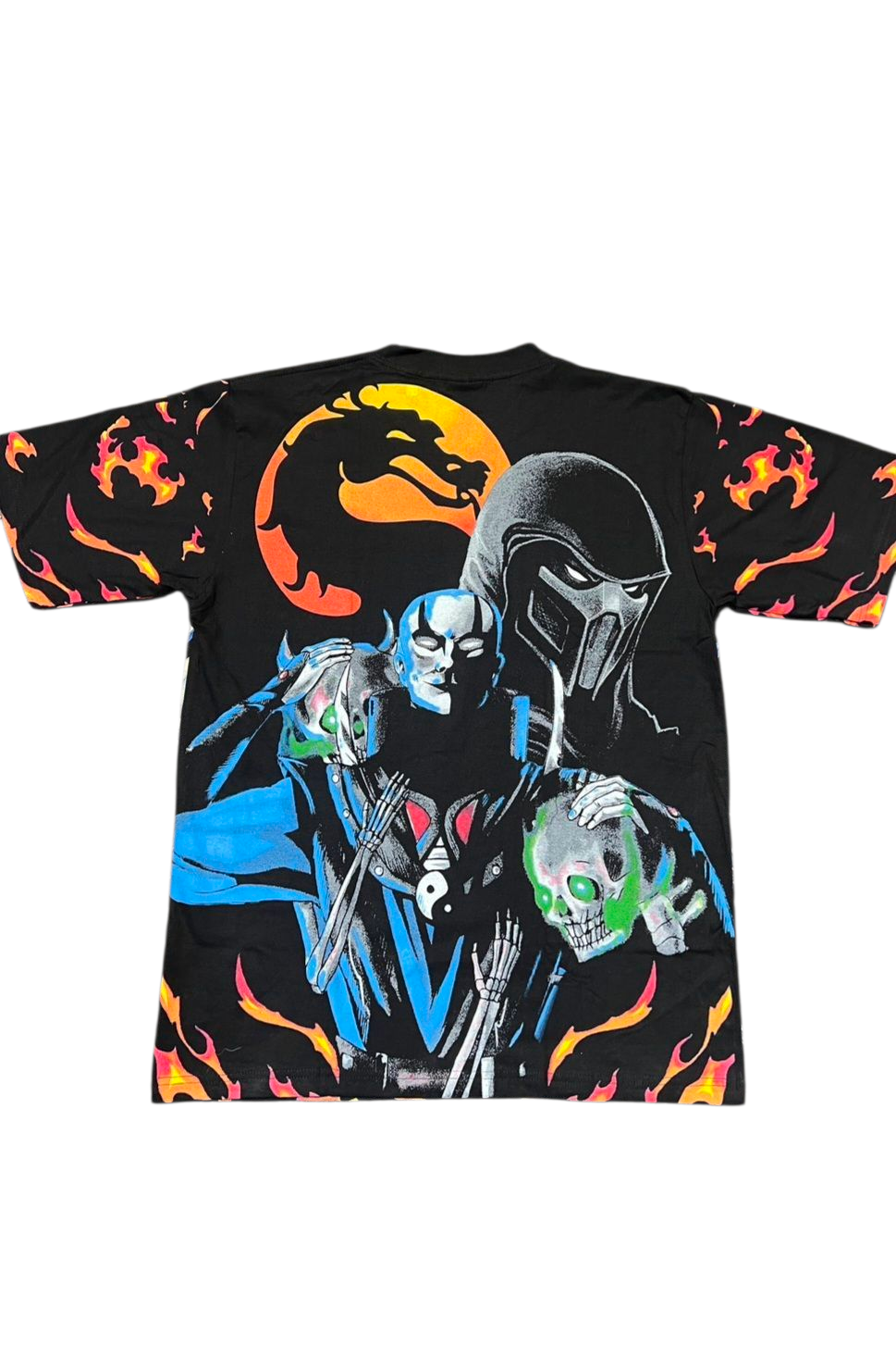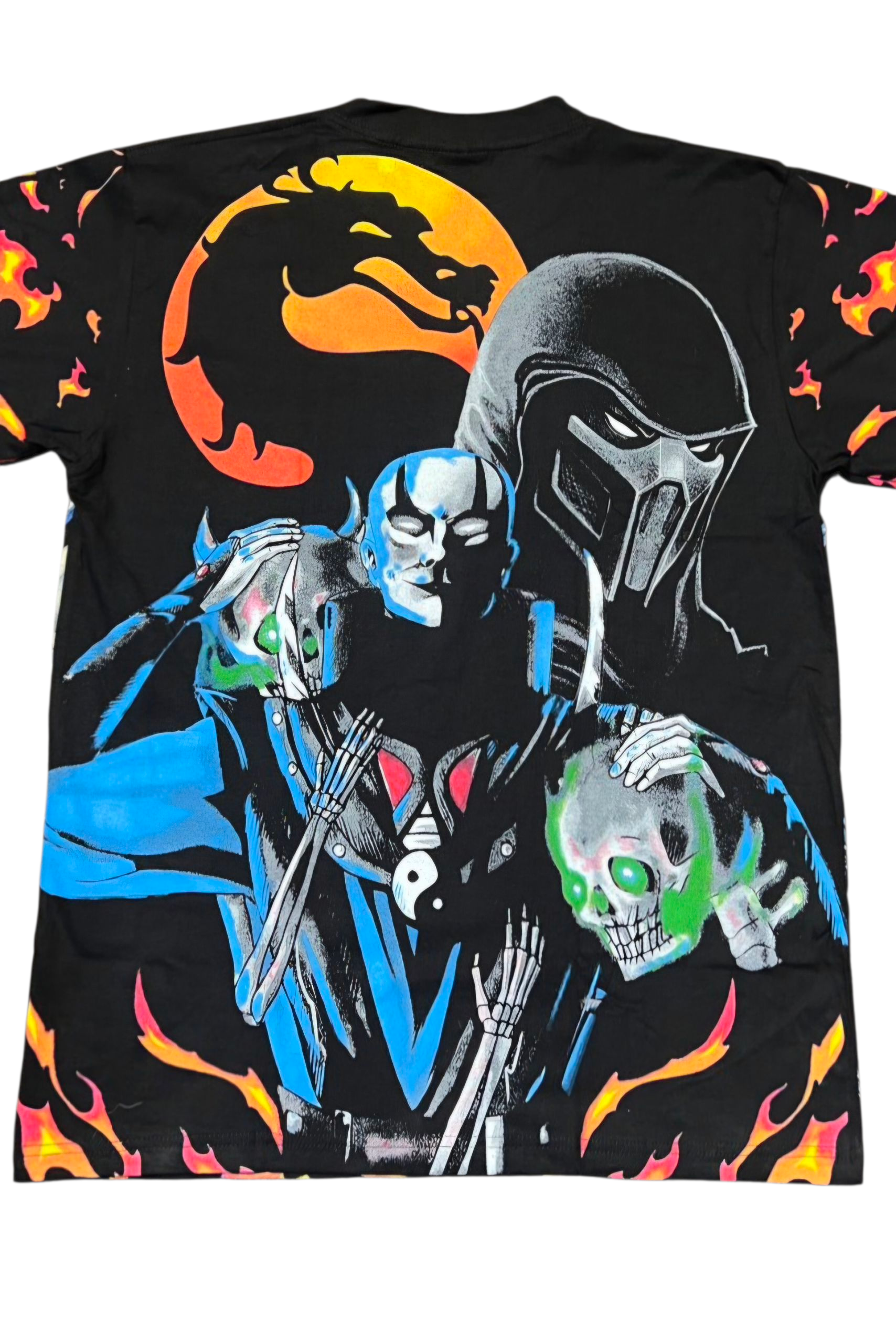 Turn it around for even more kombat energy: the back features Smoke, Quan Chi, and the unmistakable Mortal Kombat dragon symbol — a tribute to the franchise’s legacy and its most fearsome fighters.