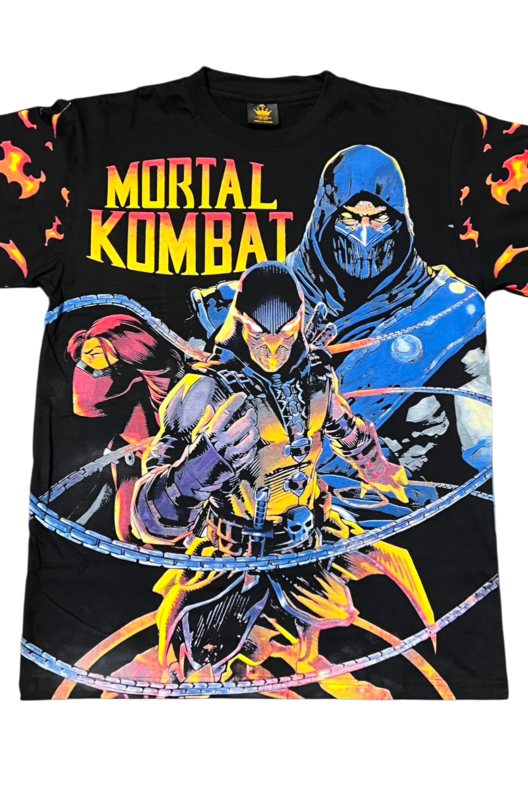 On the front, the tee showcases Scorpion front and centre — blazing with vengeance — flanked by the deadly Mileena and the ice-cold warrior Sub-Zero. Each character is rendered in crisp, dynamic detail that captures their iconic powers and rivalries.