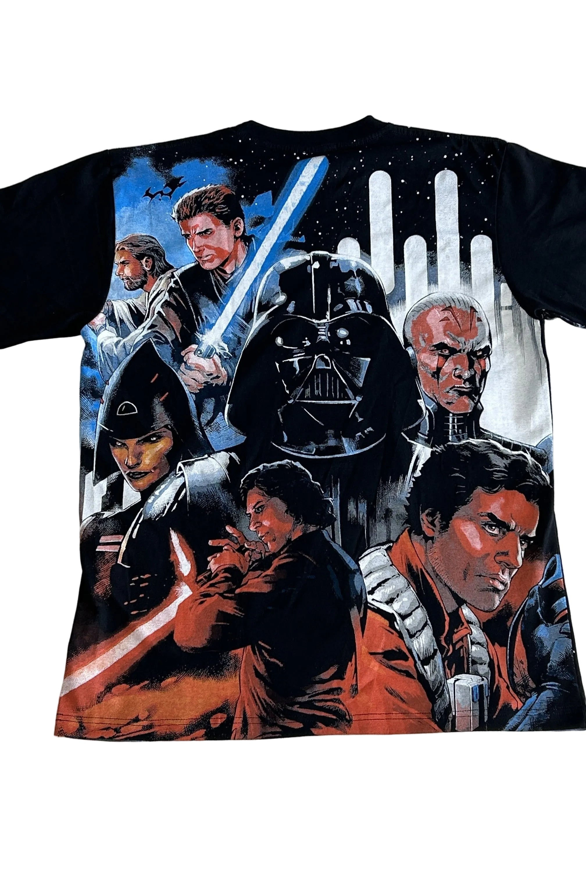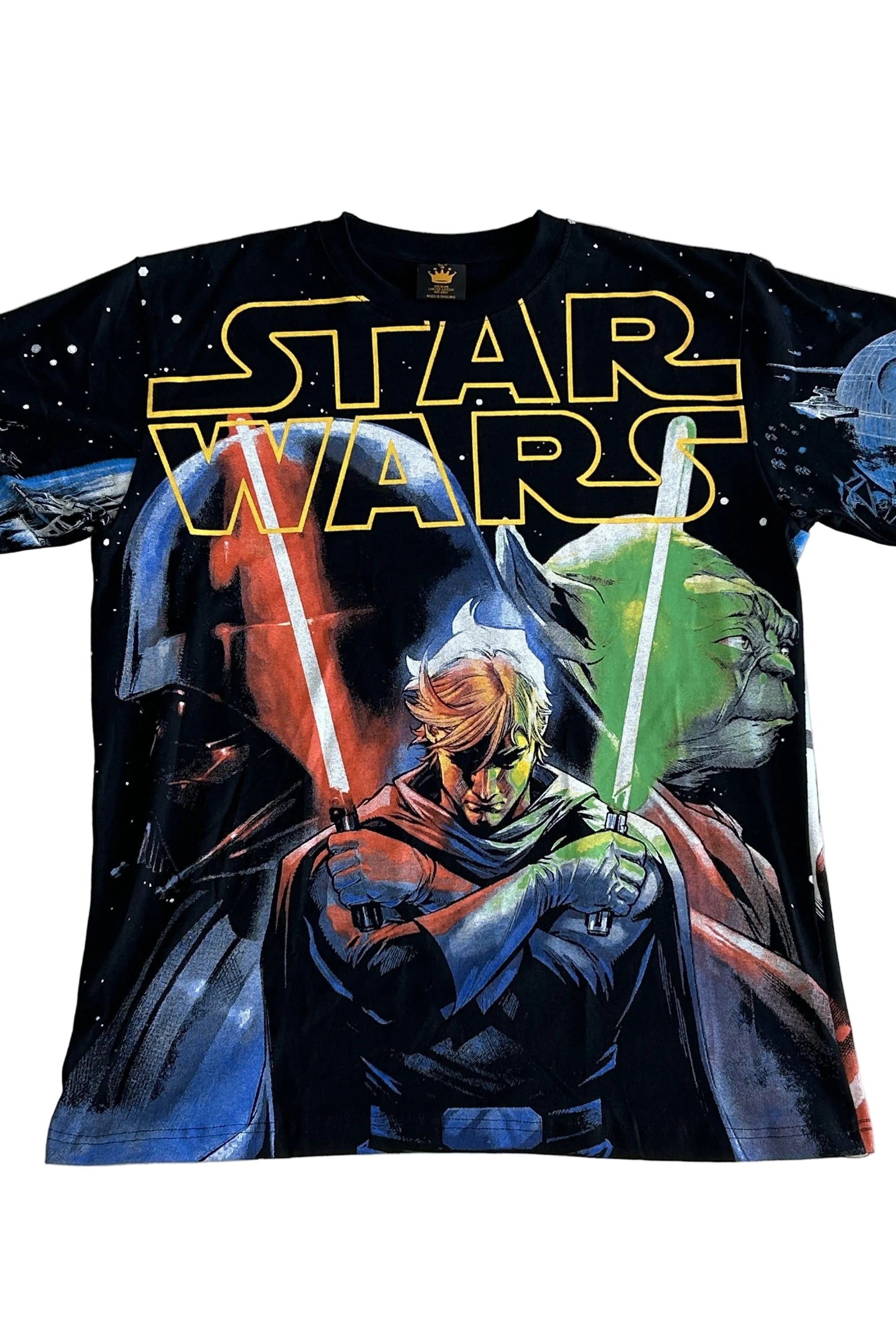 A tribute to the heart of the Star Wars saga, this striking tee features an all-over graphic print packed with iconic imagery. The front design showcases Luke Skywalker wielding two lightsabers, standing at the centre of destiny, shadowed by the wisdom of Yoda and the looming darkness of Darth Vader.