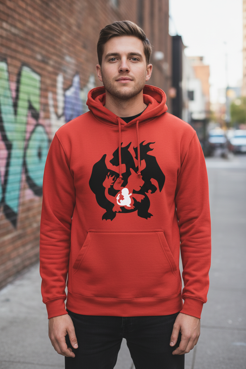 This bold red hoodie features the full Charmander evolution line — Charmander, Charmeleon, and Charizard — celebrating one of the most iconic fire-type starters of all time. Instantly recognisable to Pokémon fans, the design captures the journey from a small flame to one of the most powerful dragons in the Pokédex.