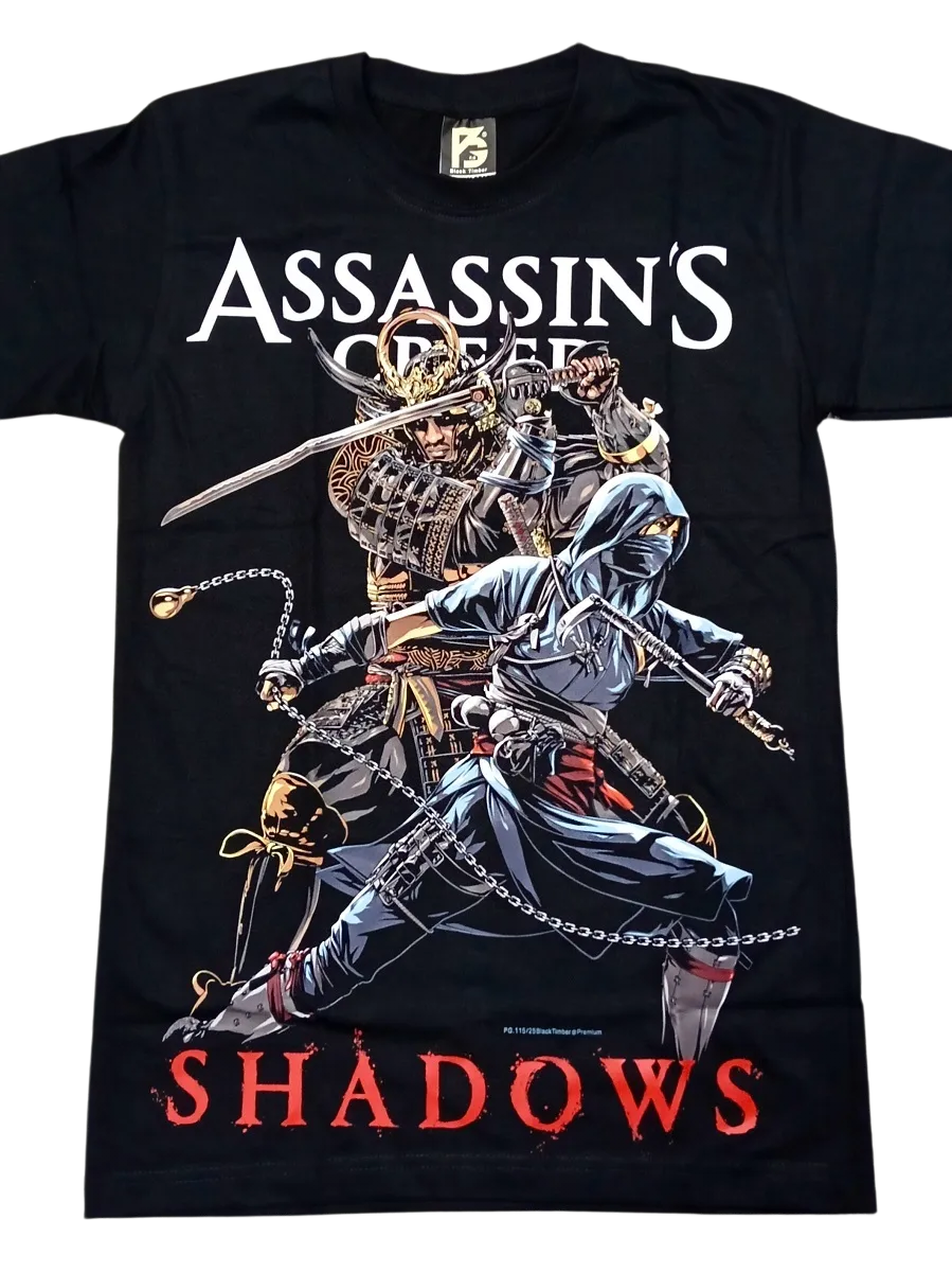 Step into the shadows with this high-quality black cotton T-shirt featuring bold graphic art inspired by Assassin’s Creed: Shadows.