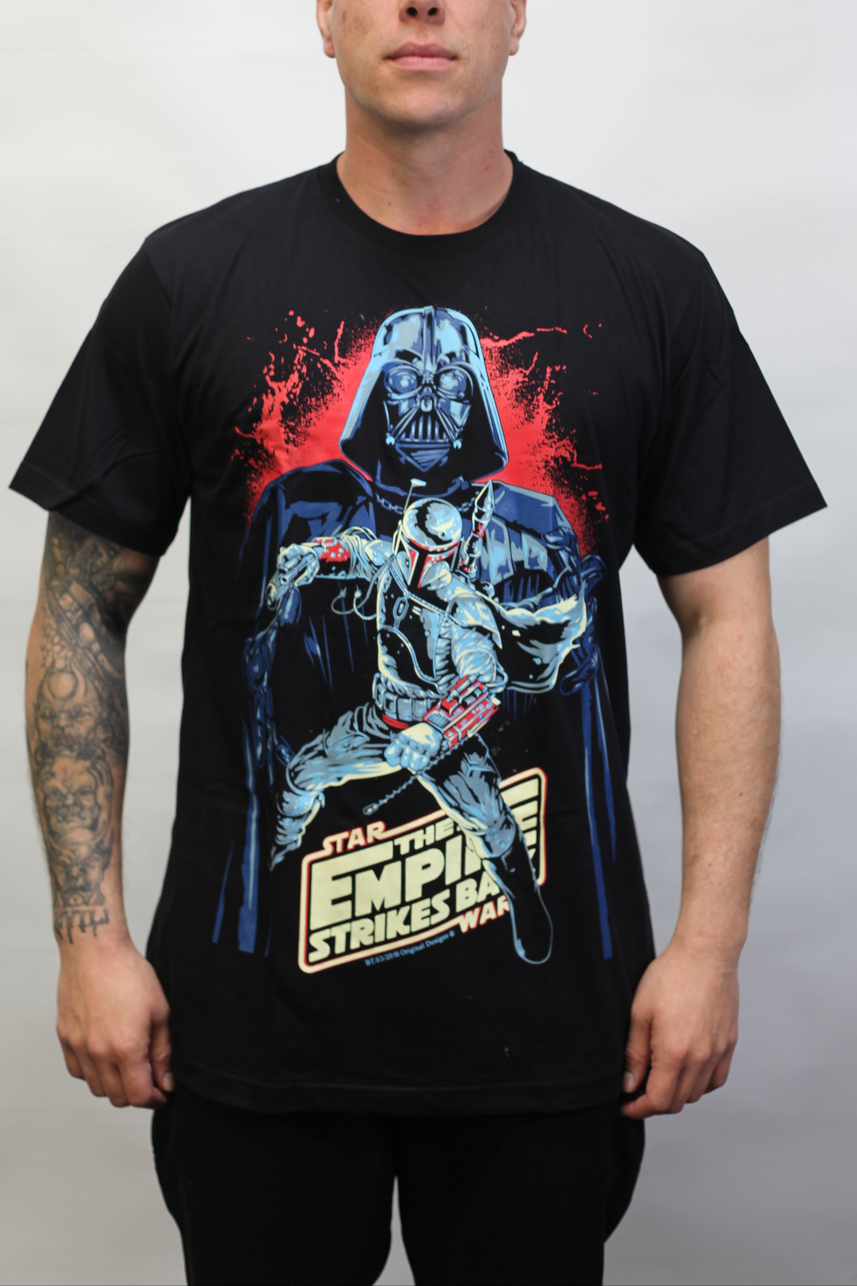 Two legends. One galaxy. This high-quality black cotton T-shirt features a bold graphic art mash-up of Darth Vader and a Mandalorian warrior from Star Wars.
