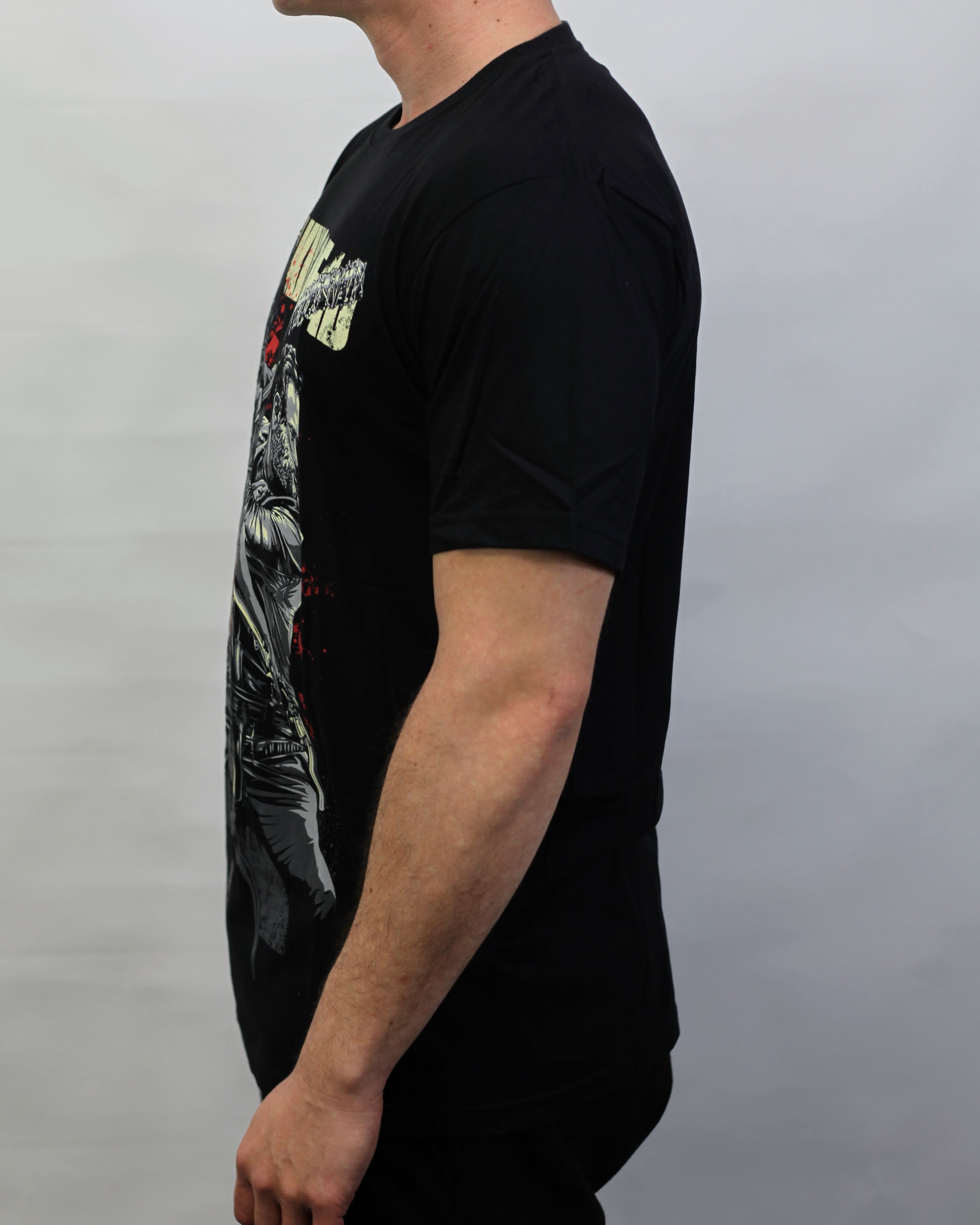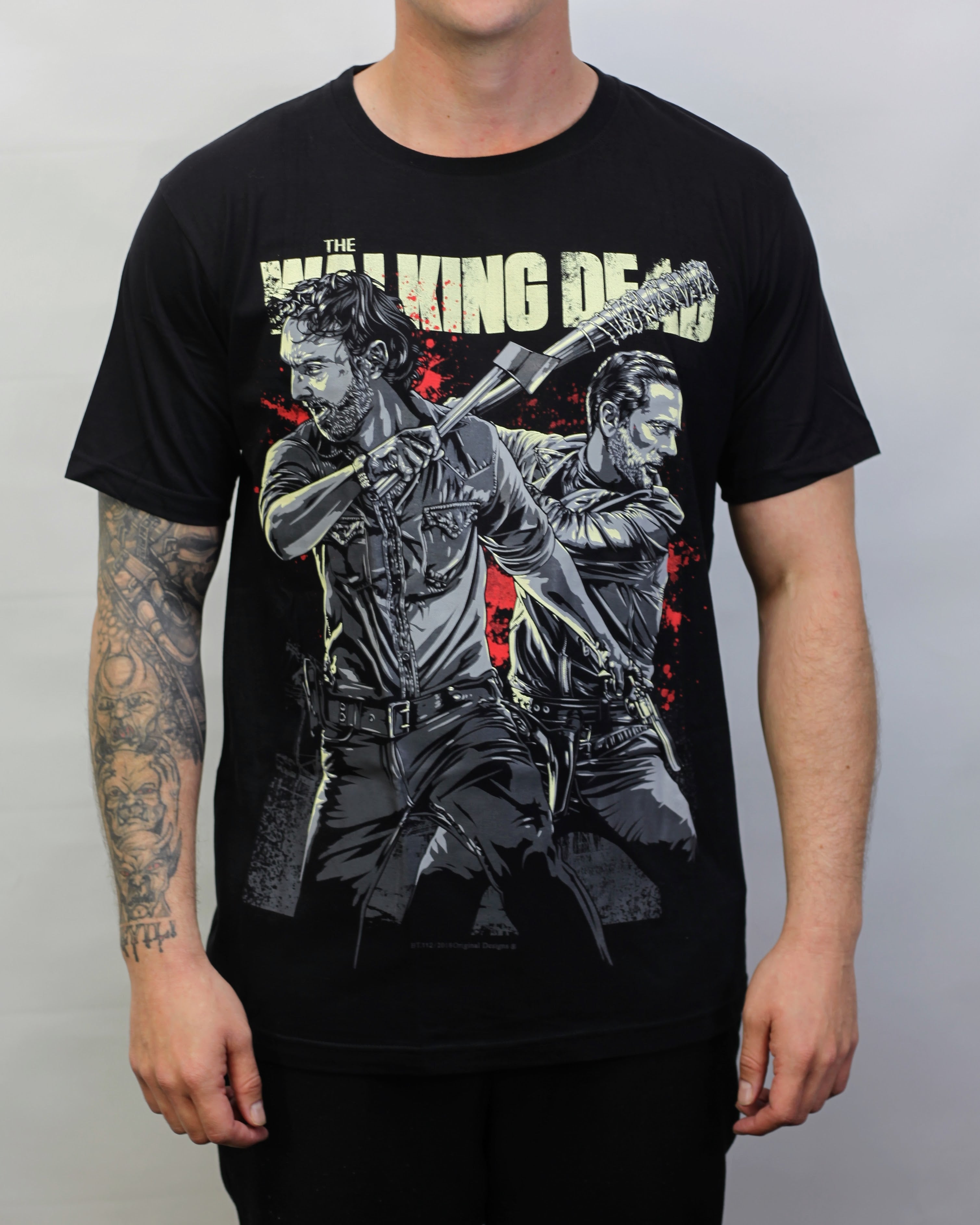 Two icons. One world. This Walking Dead T-shirt features Rick Grimes and Negan standing strong, weapons raised, in a powerful moment of tension and survival. With both leaders armed and ready, this design captures the grit, complexity, and uneasy alliance of two of the most unforgettable characters in the series.