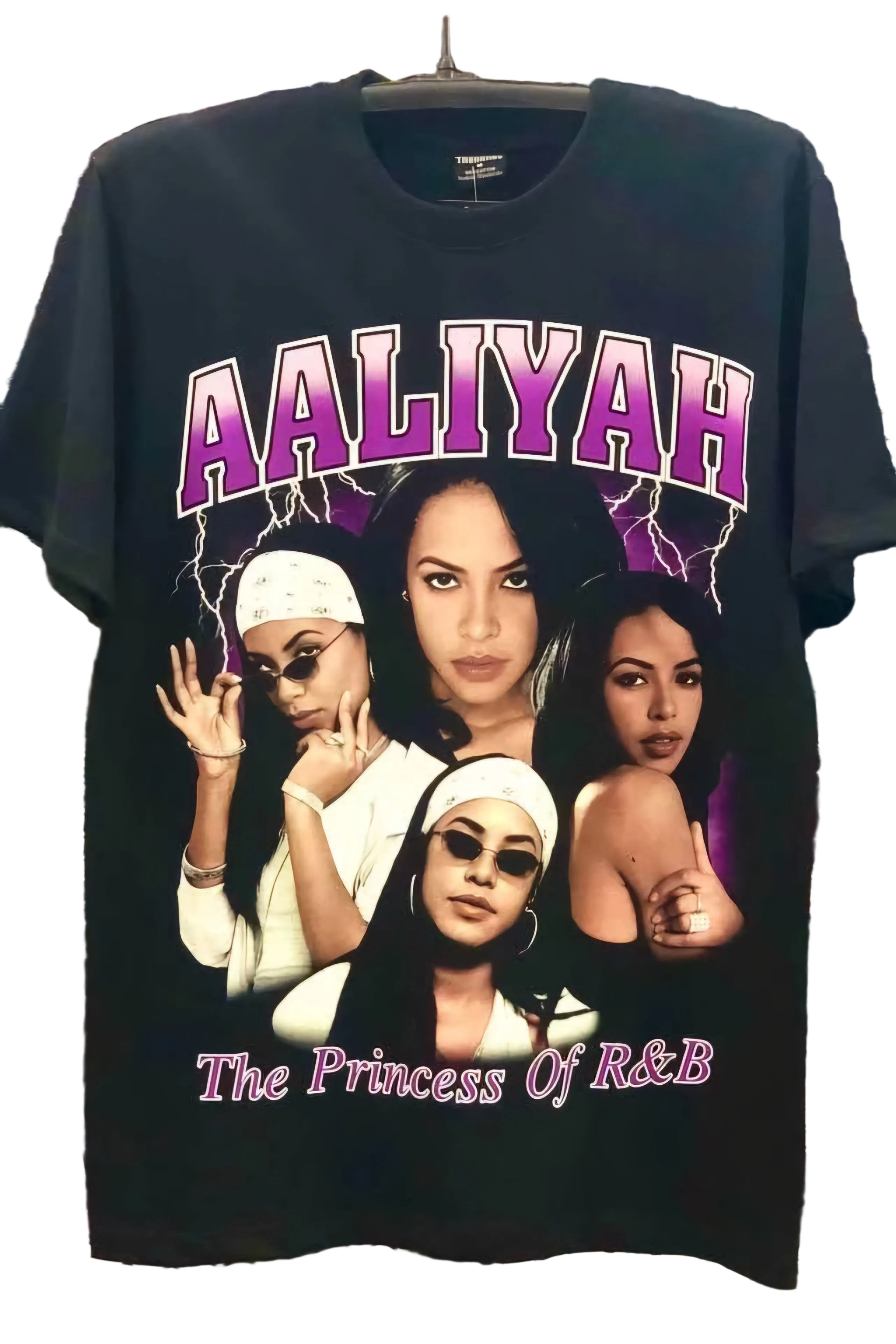 Featuring a bold, stylish graphic of Aaliyah: the Princess of R&B, this design captures her timeless influence, effortless cool, and unforgettable artistry. Whether you’re dressing it up, rocking it with denim, or adding it to your collector lineup, this tee is the perfect tribute to a legend gone too soon.