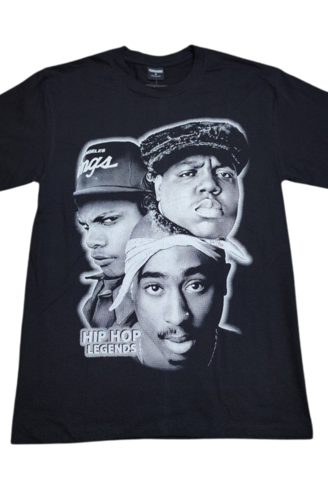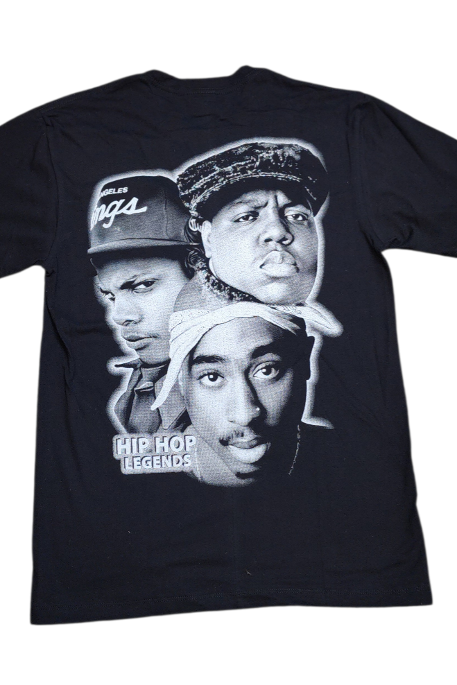 A powerful tribute to the icons who shaped the culture, this premium black tee features Tupac Shakur, Eazy-E, and The Notorious B.I.G. brought together in bold, high-quality front and back prints. Finished with the statement caption “HIPHOP LEGENDS”, this tee celebrates an era that changed music forever.