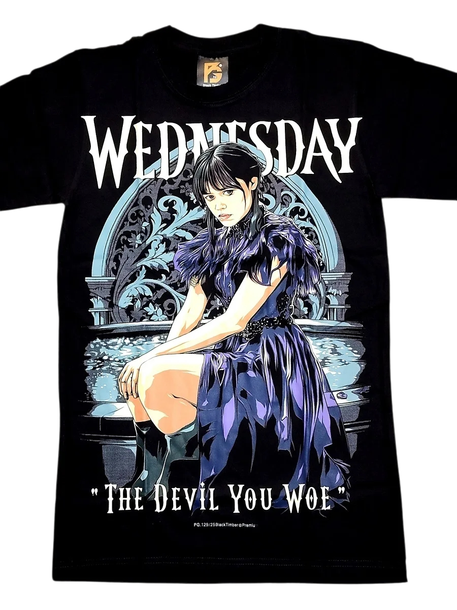 Dark, deadpan, and effortlessly iconic — this black tee features Wednesday Addams from the hit Netflix series Wednesday - "The Devil You Woe". Capturing her signature gothic style and razor-sharp attitude, the design channels mystery, rebellion, and unapologetic individuality.